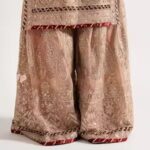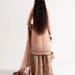 Step into regal elegance with this gorgeous dusty pink gharara suit by Rittaj Collection. The outfit features a finely embroidered long shirt with delicate motifs and beadwork, beautifully paired with a heavily embellished gharara for a dramatic and traditional flair. The sheer dupatta is enhanced with matching embroidery and maroon accents, adding richness and depth to the ensemble. Perfect for bridesmaids, wedding guests, or formal events, this outfit embodies classic luxury with a modern touch. Add timeless charm to your wardrobe with this exquisite piece from Rittaj Collection.
